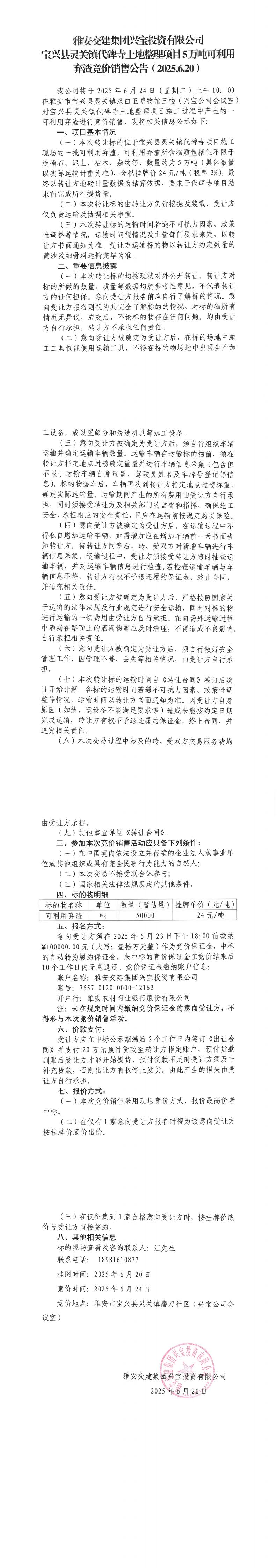 雅安交建集團興寶投資有限公司寶興縣靈關鎮(zhèn)代碑寺土地整理項目5萬噸可利用棄渣競價銷售公告